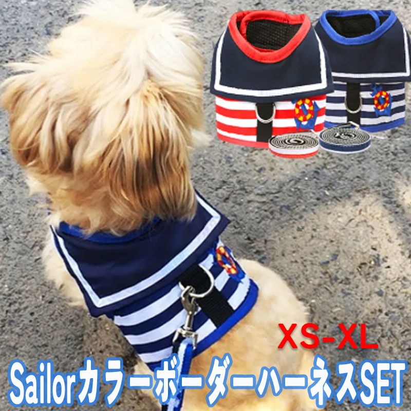 犬 猫 ハーネス リード付 ペット 服 セーラー マリン ボーダー 胴輪 キャット ドッグ メッシュ